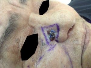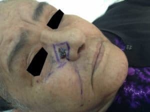 Η αφαίρεση γίνεται σε τοπική αναισθησία με ατρακτοειδή εκτομή, εφόσον επιτρέπει το είδος και το μέγεθος του όγκου μέσα ή παράλληλα στις φυσικές πτυχές -ρυτίδες -του δέρματος του προσώπου και άμεση σύγκλιση- συρραφή του δέρματος χωρίς τάση. Εφόσον ο όγκος είναι μεγάλος, η αποκατάσταση του ελλείμματος σε δέρμα, μετά την αφαίρεση του, γίνεται με τεχνικές πλαστικής χειρουργικής- δερματικοί κρημνοί ή δερματικά μοσχεύματα.